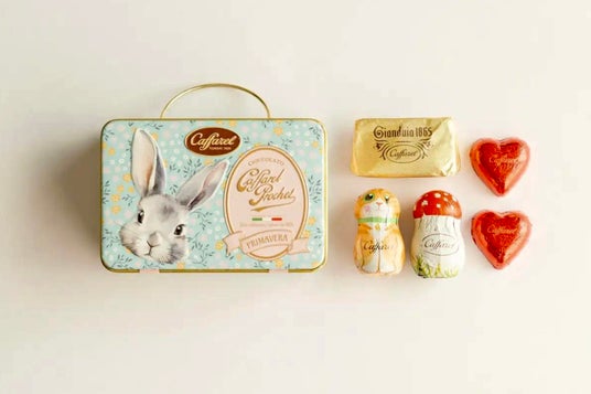 詳細:さわやかなブルーを基調としたミニトランク缶に、愛らしいうさぎと可憐な小花が描かれています。中にはカファレルの代名詞であるジャンドゥーヤをはじめ、キノコやミニハート、ネコなどのキュートなホイルチョコレートが5粒アソートされています。