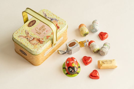 詳細:あたたかい春の陽だまりの中、ウサギやリス、ヒヨコたちが楽しく遊ぶ様子が描かれたバスケット缶。思わずピクニックのおともに持って行きたくなるような可愛さです。中には定番のジャンドゥーヤをはじめ、くちどけ滑らかなクレミノキューブや愛らしい表情のてんとう虫のホイルチョコレートなどが10粒アソートされています。