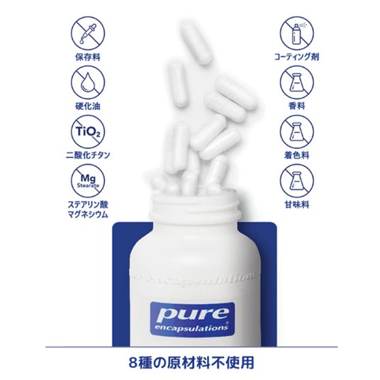 「Pure Encapsulations」はアメリカの医療専門家からの信頼度No.1のサプリメントブランド※2として、その品質に高い評価を獲得しています。「Pure Encapsulations」の製品は8つの原材料(コーティング剤、香料、着色料、甘味料、保存料、硬化油、二酸化チタン、ステアリン酸マグネシウム)を使用せず、またグルテンフリー認証機関(GFCO)で監査された施設でグルテンを使用せずに製造しています。