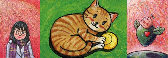 アクリル絵の具を使用し、独特の凹凸感で「重厚で可愛い」 他にない表現で全国で展覧会活動中。絵本・キャラクターデザイン・宝くじイラストなど様々な媒体でも活躍。