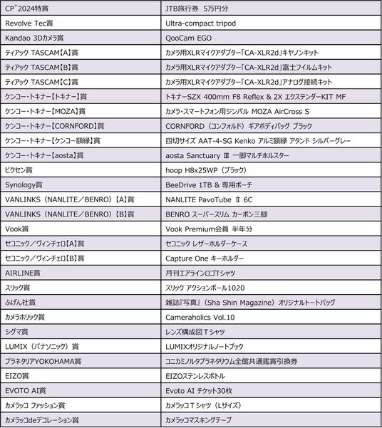 「CP+2024」の会場でアンケートに答えると、カメラ関連製品や旅行券、アパレルグッズ、文具など、主催者・出展社からの多種多様な豪華景品が当たるチャンス!ぜひ会場でエントリーしてお楽しみください。