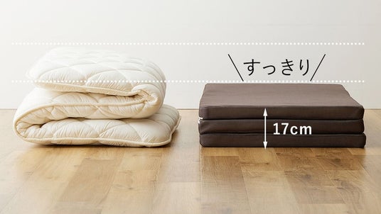 中わた入りの敷布団と比較するとコンパクト(写真右)。1人暮らしの収納でもスペースを取らず、また家族分を重ねて収納してもかさばりません。クローゼットや隙間にも省スペースで収納が可能です。