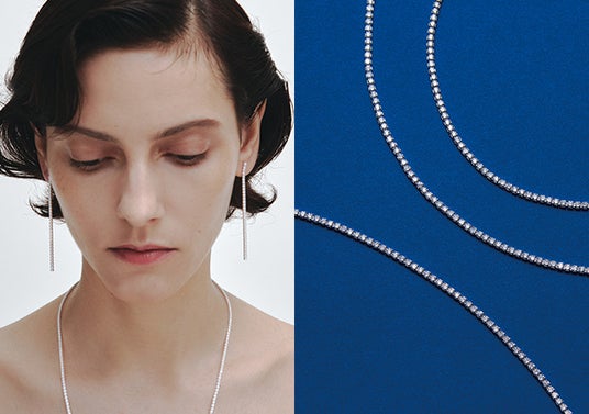 左:princess pierce SV 税込¥11,000 victoria choker WG 税込¥15,400 venus necklace WG 税込¥20,900 victoria matinee necklace WG 税込¥19,800 右:princess bracelet SV 税込¥11,000 orbit ear cuff S 税込¥9,900
