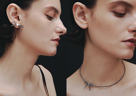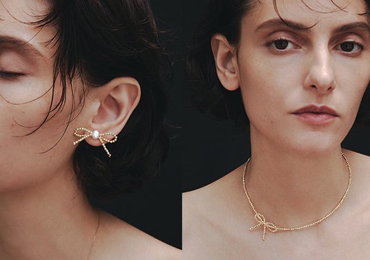 鎖骨のやや上にリボンが乗り、可憐さと華やかな魅力を生み出すショートネックレス。