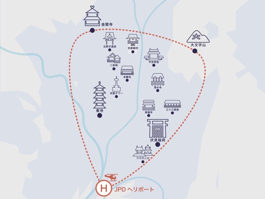 <ヘリコプター周遊ルート>伏見桃山城→伏見稲荷→東福寺→三十三間堂→清水寺→平安神宮→