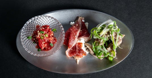 【お肉の前菜盛り合わせ3種】薬念和牛ポテトサラダ / ユッケ / 和牛スジ肉 コチュジャンマリネ