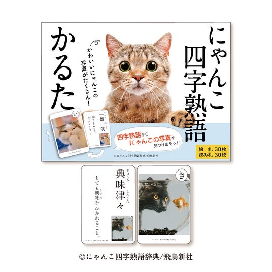 「にゃんこ四字熟語辞典」から厳選した、猫の写真と四字熟語を使用したかるたです。読み手が読み札に書かれた四字熟語とその意味を読み上げて、それに対応する絵札を取って遊ぶことができます。