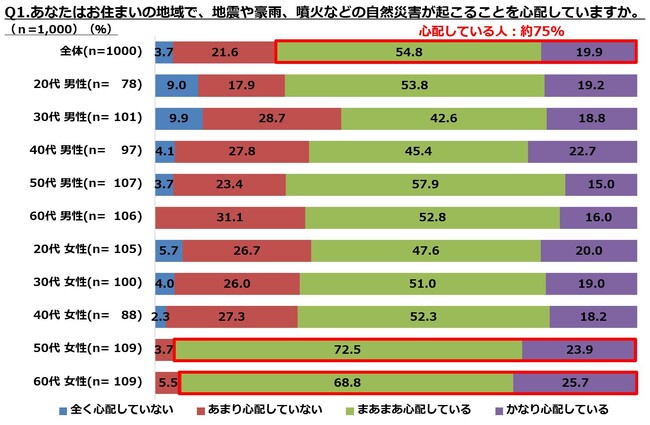 ・地震などの自然災害を心配している人は全体の4人に3人で、特に50~60代の女性に多い。