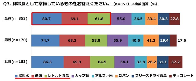 ・常備している非常食は「飲料水」「缶詰」「レトルト食品」がTOP3。「チョコレート」は男女で約20ptの差あり。