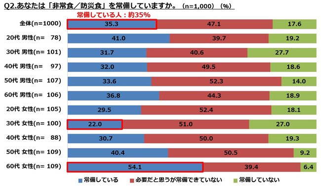 ・非常食を常備している人は35%。「必要だと思うが、常備できていない」が47%。60代女性が5割超と高い一方で、30代女性は2割程度と低い。