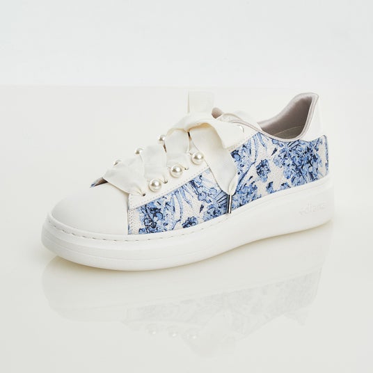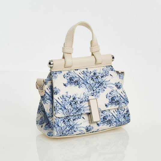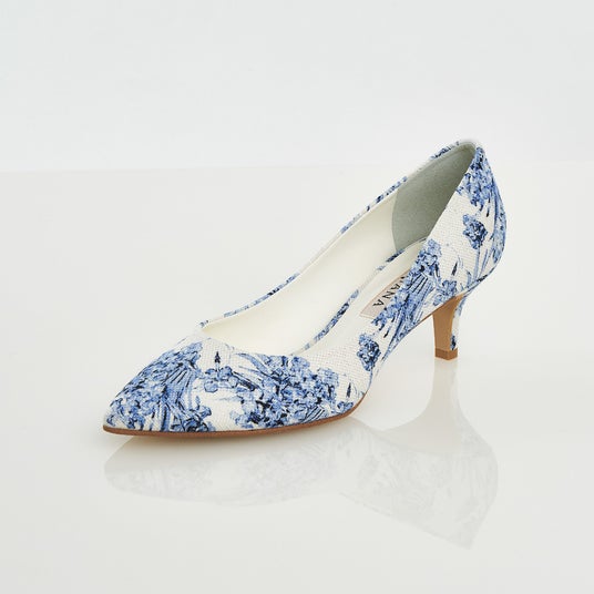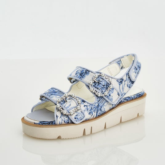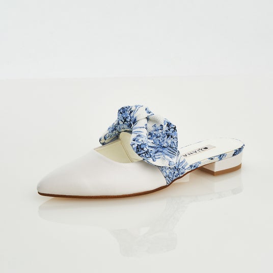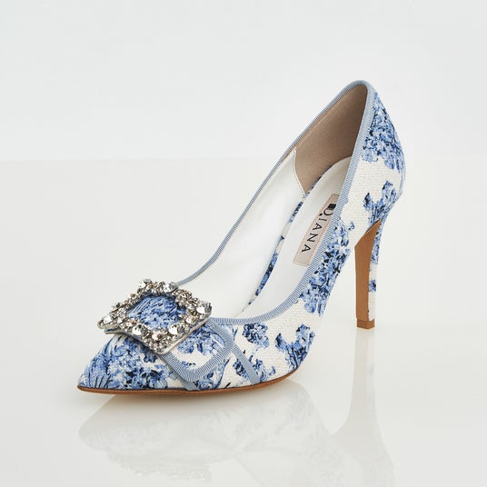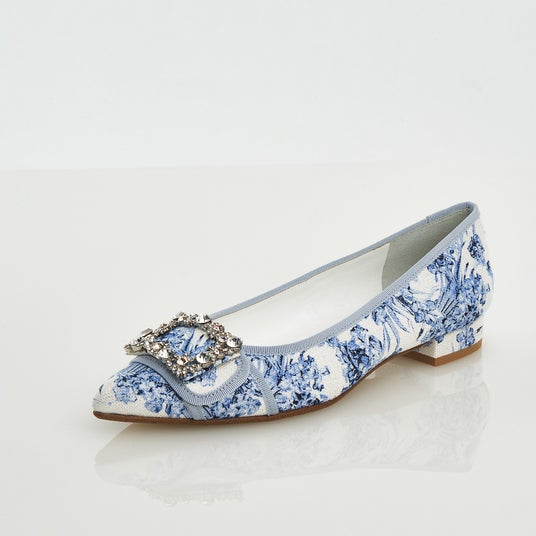 素材は銀糸を織り交ぜた生地に、アイリスのパターンをプリントしたオリジナルの素材を使用しています。細やかに輝くラメ糸とブルーの柄とのハイブリットで繊細ながらも上品な華やかさを添えてくれます。