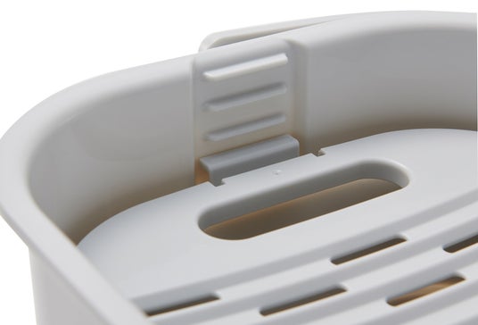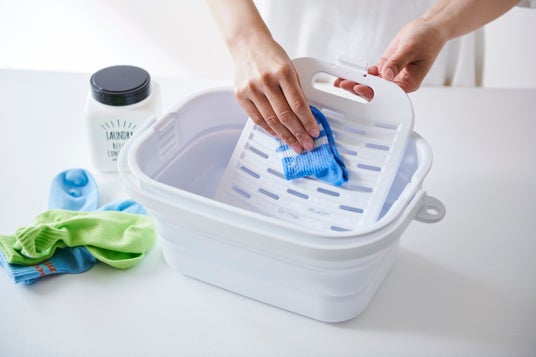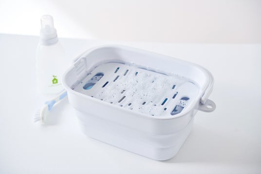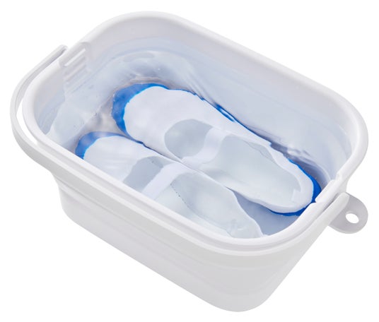 『折りたためるつけ置き洗いバケツ』には洗濯板が付いているので、つけ置き洗い前の予洗いに最適です。また、付属の洗濯板は高さ調整ができる落しぶたにも使うことができます。上履きや帽子などの浮きやすい洗い物も、洗濯板を落しぶたとして使うことで、しっかりとつけ置き洗いをすることができます。