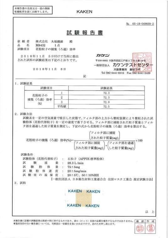もっとも暑かった昨年夏の影響から、今年も例年になく花粉の飛散量が多く、かつ飛散時期が早くなると言われています。マスクの準備が必要なこの時期、ヤケーヌは花粉対策にも効果を発揮します。花粉粒子の捕集(ろ過)効率も72.5%カットが期待できるという試験結果も計測されています。(カケンテストセンター)