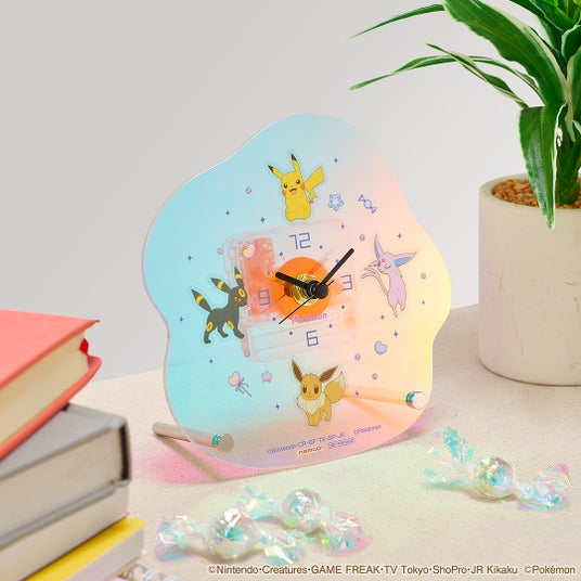 たいようポケモン・げっこうポケモンのイメージに合わせて、時計の文字盤にエーフィ・ブラッキーをデザイン。オーロラアクリルで文字盤の色の変化が楽しめます。