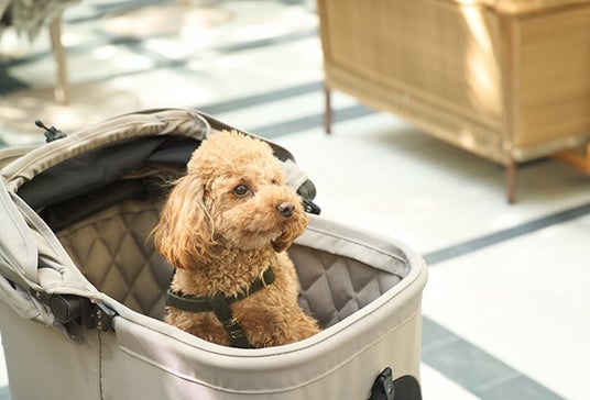 コットとフレームが分離するセパレートスタイルは、公共スペースや飲食店などペットを表に出せないけれどフレームは折りたたみたい、といったシチュエーションで役立ちます。階段もさっと折りたたんでスムーズに降りられます。