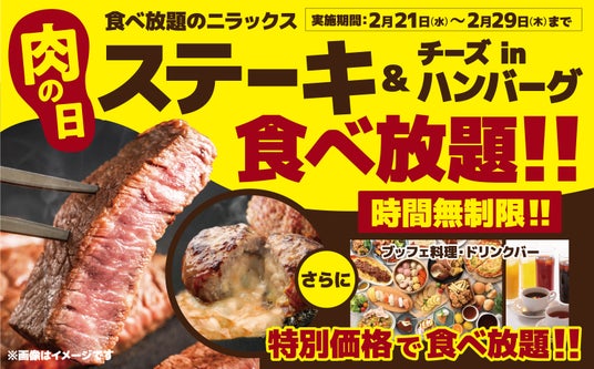 食べ放題のテーマパーク、 ニラックス株式会社(本社:東京都武蔵野市、 代表取締役社長:崎田 晴義)が運営する『ニラックスブッフェ』30店舗では、2024年2月21日(水)~ 2024年2月29日(木)の平日ディナーWEB予約限定にて、肉メニューがたっぷり味わえる『プレミアムコース』がお得にご利用いただけます!