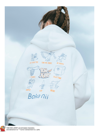 様々な「トムとジェリー」がバッグプリントに施されたフーディー。