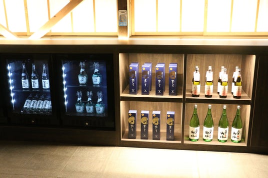 売り場スペースを広げ、ゆったりとして清楚で気品のあるブランドショップに生まれ変わりました。間接照明を生かした陳列棚で高級感を演出しています。史料館に付属する売店というこれまでの位置づけを超え、お酒などの商品のお買い物を目的に来られるお客様のニーズにも寄り添い、販売するアイテムを厳選し、月桂冠や京都の魅力を感じられる商品を、ゆっくりと選べる売り場へと刷新しました。ショップ内には記念館限定の日本酒を中心とした月桂冠のアイテムを並べ、酒質が繊細な日本酒については、新たに定温のセラーを4台導入し温度管理を徹底しています。定温セラーを含め、ショップ東側の棚一面に、多数のお酒のアイテムを配置した壮観な売り場演出としました。