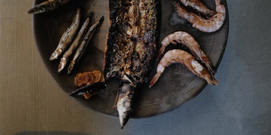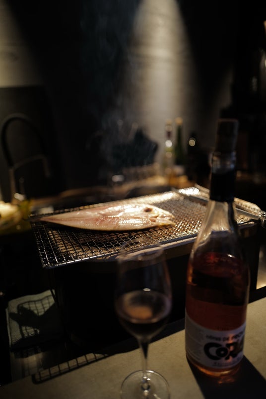 火山灰で水分を除いた高級干物。灰干しを炭火でナチュラルワインと共に。