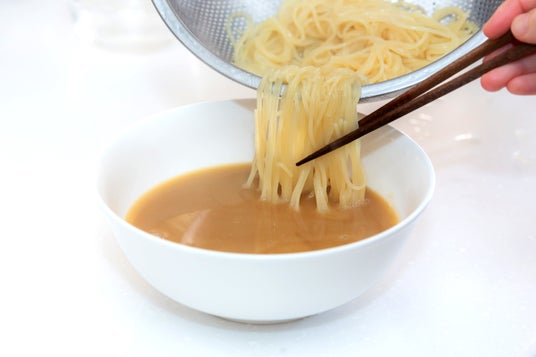 茹で上がったライスラーメンを器に