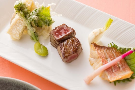 <春のおすすめディッシュ>野菜とたけのこの天婦羅、白身魚の幽庵焼き、牛肉のポワレ 玉葱と林檎のおろしソース、五目ご飯、お吸い物、お新香