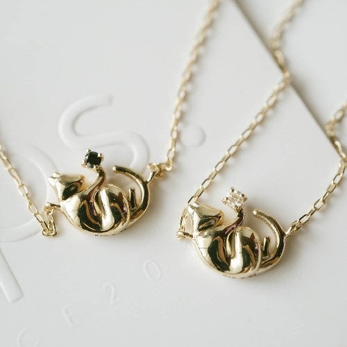 Zoi-cat-gem ゾイ・キャット・ジェムシンプルな猫モチーフのK10イエローゴールドネックレス。天然石のカラーは2種類。4月の誕生石でキラキラ煌めくダイヤモンド、シックな大人の宝石ブラックダイヤモンド。幸運を呼び寄せるモチーフとしても人気です。
