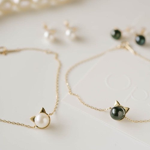 Fortuna-cat-br フォルトゥナ・キャット ブレスレットエレガントな淡水パールが手元で優しく煌めく、猫モチーフのブレスレット。華奢なゴールドチェーンが手首を美しく演出。