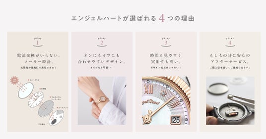 「エンジェルハート」は、進学や入社、新たな一日の始まりなど、人生の大切な節目を迎える女性に寄りそうファーストウォッチとしてぴったりなブランドです。2004年4月に誕生して以来、多くの女性に親しまれています。