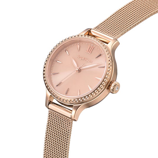 サンレイダイヤルケースとブレスレットに施した新色『プレシャスゴールド』に、光の当たり方によって放射線状に艶めくサンレイ仕上げを施したピンクベージュの文字盤を合わせました。ブレスレット、文字盤共に肌なじみの良いカラーリングです。