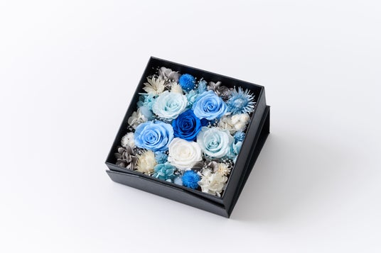 COREDO日本橋カラーの「ブルー」をテーマに、ブリザードフラワーとドライフラワーを贅沢に使用したボックスアレンジ。