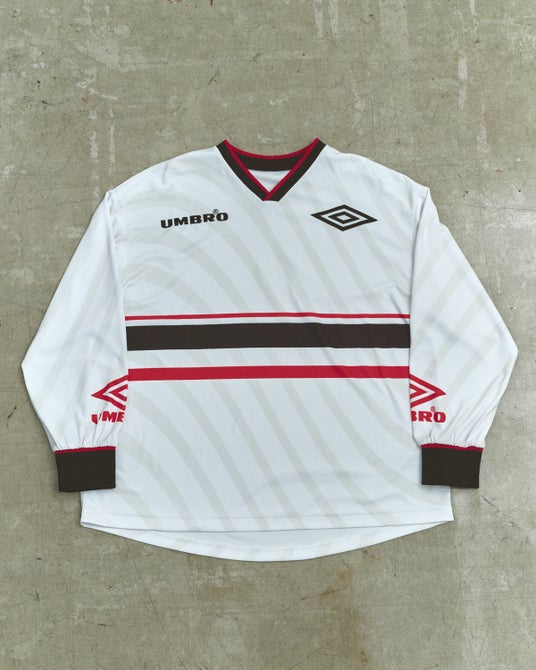 ゲームシャツ ¥16,500( 税込)24SS GAME SHIRTS|ゲームシャツ“〈UMBRO〉といえば、【 Manchester United Football Club(マンチェスター・ユナイテッド)】”のイメージから、若かりしデビッド・ベッカムが当時所属していたチームのユニフォームのデザインを一部引用するような形でグラフィックを作成し、デザインしたアイテム。当時のウエアは襟付きでしたが、今回は襟なしのV 開きにアップデートし、ロンT のような感覚でスッキリした印象です。カジュアルに振り切ったコーディネートや、ジャケット羽織ってスポーツミックスを楽しんだりと、色々なコーディネートを楽しめるアイテムです。