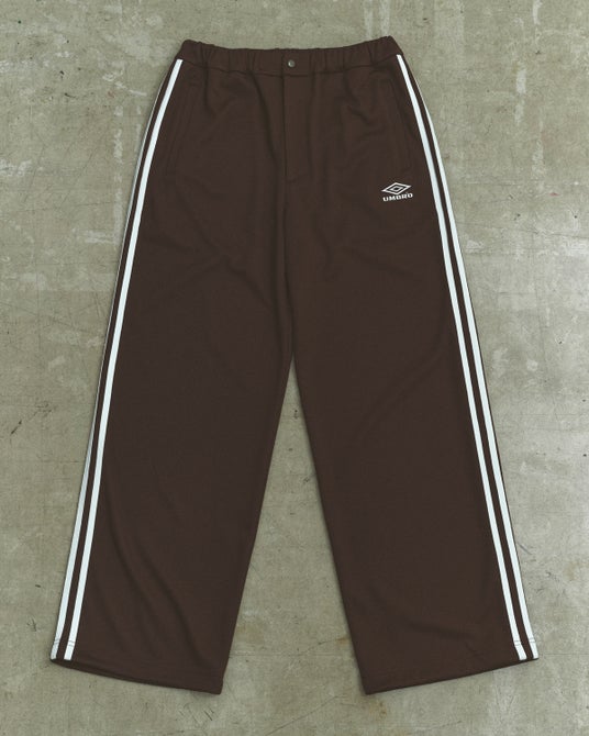 トラックパンツ ¥20,900( 税込)24SS JAZZY TRACK PANTS|トラックパンツトラックジャケットにセットアップで着られるジャージーパンツ。裾口は、あえてリブ素材で絞らずに、ミリタリーパンツのように平紐のドローコード仕様にしストレートにデザインしすっきりとしたシルエットに。足元でたわむボリューム感も楽しめるデザインです。側章つきのデザインは綺麗な目面の素材なので、カジュアルな印象ながらスラックスのような感覚でも着用いただけます。ジャケット同様3 サイズ展開でセットアップで