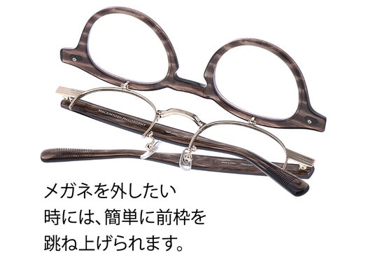その存在が意外と知られていない 跳ね上げメガネ。手元を見る際メガネを外したい時にカンタンな操作で、メガネを跳ね上げることができます。跳ね上げていない時はお洒落なメガネとして使用できる優れもので、使うとわかる便利アイテムです。