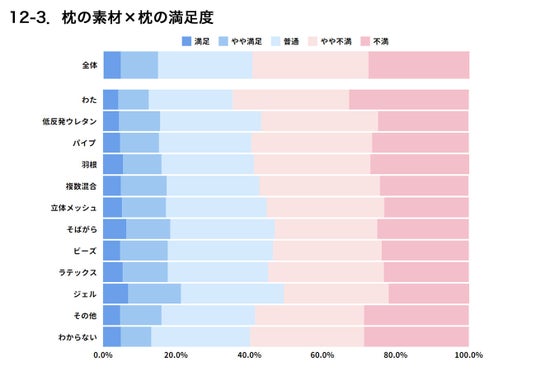 一方、満足傾向が多い素材は「そばがら」「ジェル」だった。そばがらは昔ながらの愛好家がおり、ジェルは体圧分散にすぐれた素材であるため、機能性の高さが満足度につながっていると考えられる。