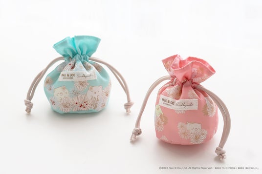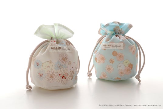 クリザンテームからすみっコたちが覗いている愛らしい姿をデザインした巾着ポーチです。大きいサイズはポール & ジョーの定番カラーであるアイボリーとブルーの2色展開。小さいサイズはPOPなカラーのブルーとピンクを採用しました。かばんの中で散らかりがちな小物をいれる事ができるので持ち運びに便利です。