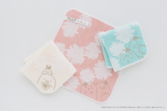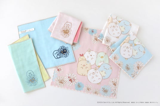 クリザンテームからすみっコたちがひょっこりと顔を出す刺繍がポイントの一枚や仲良く寄り添うすみっコたちがクリザンテームに包まれているガーゼハンカチは、キャラクターやポール & ジョーのイメージしたカラーを使い優しい雰囲気に仕上げました。親子でお揃いで持てるよう2サイズ展開の4重ガーゼハンカチです。