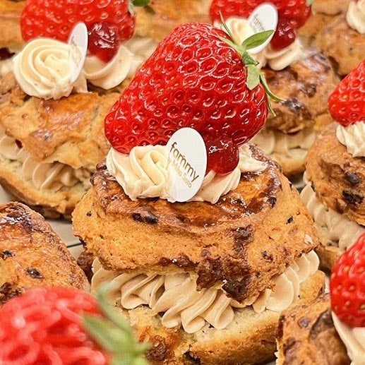 『ローグウェルシュケーキ』はグランビル家の母マリア氏と息子のジョー氏の2人が2020年にスタートしましたが、祖母リズ氏によって1990年代からその基盤が形作られてきました。『ローグウェルシュケーキ』の特徴は普通のウェルシュケーキの枠にとどまらないこと。素材と風味にこだわり自由な発想で作られるローグのウェルシュケーキは、伝統的なフレーバー「トラディショナル」からセイボリー系まで、ひねりの効いたレシピの数々でファンを増やし魅了し続けています。「英国展 2024」には創業者でありオーナーのジョー氏が来日し、「ヴィクトリア スポンジ」「トラディショナル」「ホワイトチョコレート&レモン」「ドライトマト&フェタチーズ」の4種を実演販売します。会場で心を込めて1点1点焼き上げるこだわりの『ローグウェルシュケーキ』をぜひ楽しみください。a/バニラが香るシンプルなウェルシュケーキにラズベリージャムとランゲージファームのクロテッドクリームをサンドしました。
