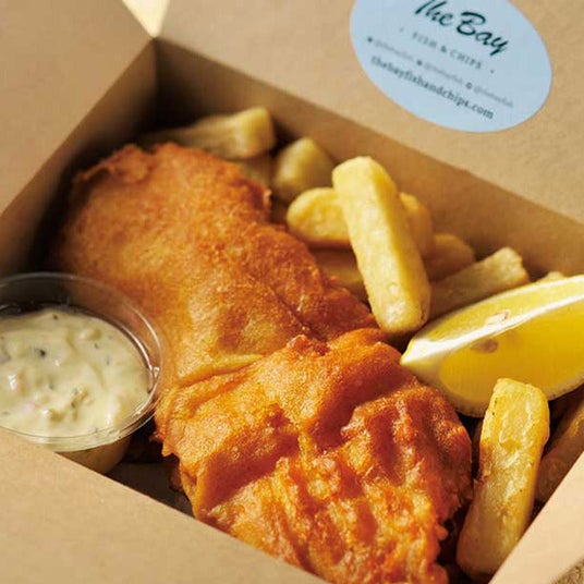 <ザ・ベイ>フィッシュアンドチップスレギュラーサイズ 1,870円 1人前、日本製ラージサイズ 2,475円[各日20点限り] 1人前、日本製 ※画像はレギュラーサイズとなります。英国フィッシュ&チップス協会(1913年設立)主催の8500店舗より選ばれた、2013年度英国No.1チャンピオン。スコットランド・アバディーン空港から車で約1時間の地元民の保養地プロムナードビーチにあるフィッシュ&チップス専門店。魚はハドック(大西洋タラ科)を使用し、揚げ粉も「ザ・ベイ」オリジナルの揚げ粉を英国から輸入、本場英国のチャンピオンの味を特別に再現しており、サクッとした衣に中身の魚はとても柔らかくジューシーです。また、油は純正ピーナッツオイルを使用し、チップスを揚げます。