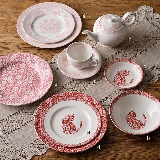 <バーレイ>レッドキャリコキャットa.プレートS(直径約17.5cm) 4,180円/b.シリアルボウル(約直径16×H4.5cm) 4,180円/c.フルーツプレート(直径約12cm) 3,080円 キャリコ d.e.プレートM(直径約21.5cm) 各4,950円 ピンクアジアティックフェザンツ f.プレートS(直径約17.5cm) 4,180円/g.プレートM(直径約22cm) 4,950円/h.ティーポットS(容量:約500ml) 17,600円/i.カップ&ソーサー(容量:約210ml) 8,250円 ともに陶器、英国製