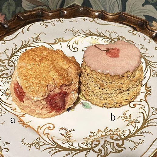 出店期間:3月6日(水)~3月9日(土) <ティーサロンブルームーン>a.いちごバターミルクスコーンb.桜ダージリンティースコーン 各432円[各日各150点限り] 各1個、ともに日本製2020年、温泉地大分県別府市で創業の紅茶と英国菓子専門店です。英国好き、紅茶好きな方々が集う店となっています。