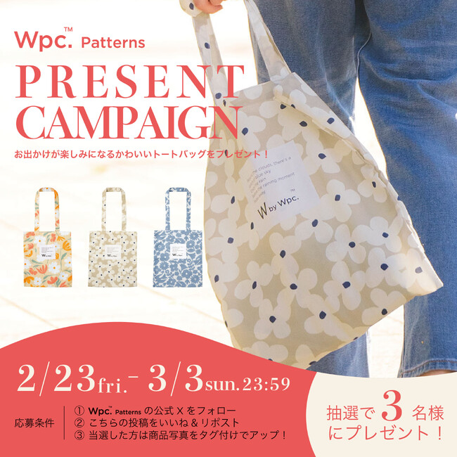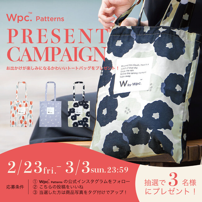 傘の国内売上高トップを誇る株式会社ワールドパーティー(本社:大阪市住吉区、代表取締役CEO:中村 俊也)が展開する傘ブランド“Wpc.(ダブリュピーシー)”から誕生したテキスタイルデザインブランド「Wpc. Patterns(ダブリュピーシーパターンズ)」では、2024年2月23日(金)~3月3日(日)の期間中、公式SNS【X(旧Twitter)&Instagram】にて抽選で合計6名様に、春のお出かけが楽しみになる春夏新作アイテム「トートバッグ」が当たる“プレゼントキャンペーン”を開催しております。