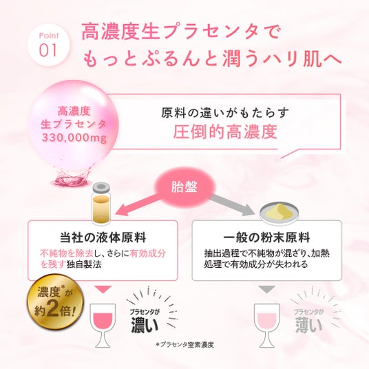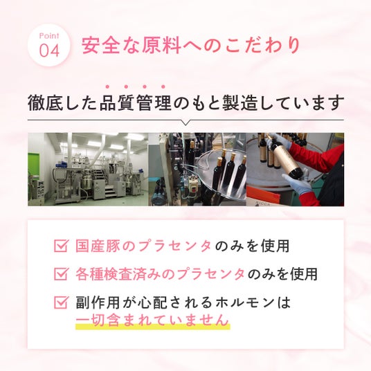 高濃度の生プラセンタエキス配合: ボトル容量500mLに対して330,000mgのプラセンタエキスを配合。(1回15mLでプラセンタ注射約5本分の9,900mgのプラセンタエキスを配合)当社独自の製法により、有効成分を保ちつつ原料臭の低減に成功。