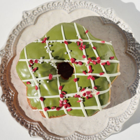 桜抹茶桜抹茶 400円(税込)桜の形をしたブリオッシュ生地のドーナツには、抹茶の風味とすっきりとした口溶けが特徴の抹茶チョコレートを合わせられています。ホワイトチョコレートでデコレーションされ、ドライフランボワーズとアラザンがトッピングされた可愛いドーナツです。