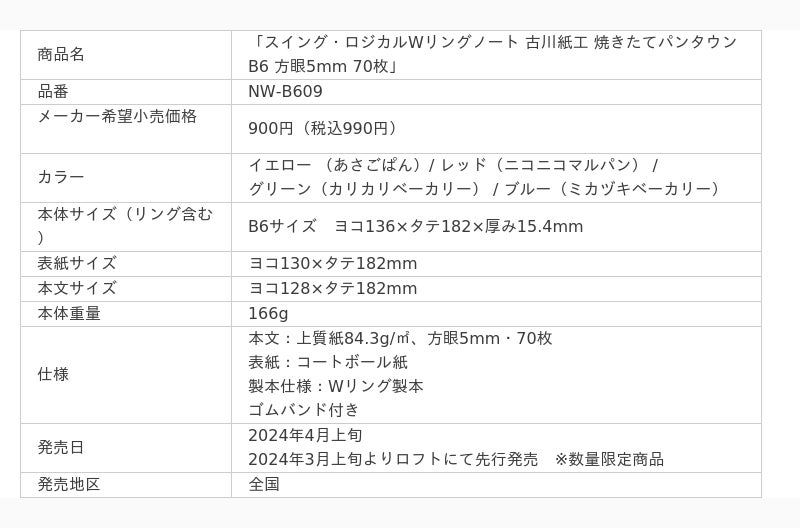ナカバヤシ株式会社(本社:大阪市中央区、社長:湯本 秀昭)は、古川紙工株式会社(本社:岐阜県美濃市 社長:古川 慎人)とコラボレーションした「スイング・ロジカルWリングノート 古川紙工 焼きたてパンタウン」を2024年4月上旬より全国で発売します。また、発売に先駆け3月上旬より順次ロフトにて先行発売いたします。
