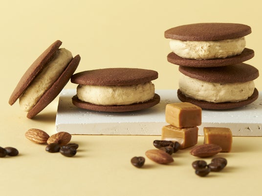 サクサク歯切れ良いココア味クッキーで、ふんわり甘くほろ苦いコーヒー風味&カリっと香ばしいアーモンドプラリネの入ったクリームをサンドしました。