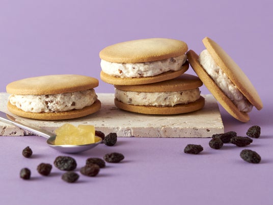 しっとりとした質感のプレーンクッキーで、芳醇なラムレーズンと、青森県産のシロップ漬けりんごを贅沢に忍ばせたクリームをサンドしました。
