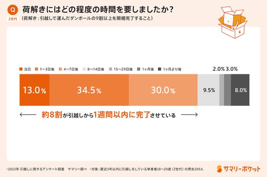 荷解きに関しては、約8割が引越しから1週間以内に完了させていることが分かりました。(荷解き:引越しで運んだダンボールの9割以上を開梱完了すること)