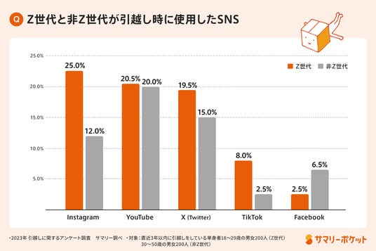 引越し時にYouTubeは世代差なく5人に1人が活用している一方、Instagramは非Z世代と比べ利用割合が10%以上高い結果となりました。