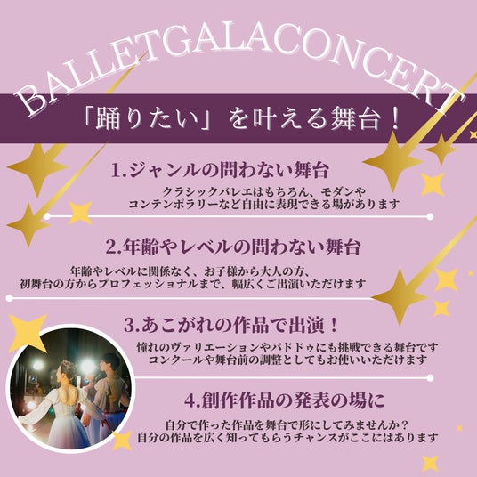 「踊りたい!」を叶える舞台 バレエガラコンサートでは、みなさんの「踊りたい!」を叶える舞台です。何歳でも、あなたの踊りたい作品を踊ることができます。本番当日までスタッフがサポートしますので、出演者は踊りの練習に打ち込むことができ、本番を安心して迎えることができます。