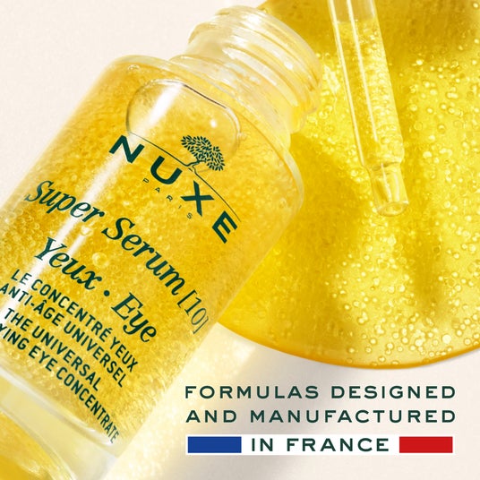 100%自然由来のボタニカルオイルをマイクロカプセル化する、先進の「マイクロフルイディック技術」を採用した「スーパー セラム」の技術を目元用に開発した「スーパー セラム アイ コンセントレイト」は、目元用のエイジングケア*¹美容液です。この革新的なテクノロジーから生まれたユニークな処方には、ニュクスが独自に開発した複合成分、エーデルワイスコンプレックス*²を配合。「ボタニカルゴールデンパール」=ボタニカルオイル*³を閉じ込めた無数のマイクロカプセルとナチュラルなヒアルロン酸*⁴が、若々しい目元に導きます。 さらに、ボタニカルカフェイン*⁵が、すっきりした印象の目元に。酷使しがちな目元のサインに働きかける有用成分を組み合わせました。「ボタニカルゴールデンパール」を散りばめた軽やかなテクスチャーによって素早く肌に浸透*⁶、ベタつくことなく、様々なエイジングサイン*⁷にアプローチします。